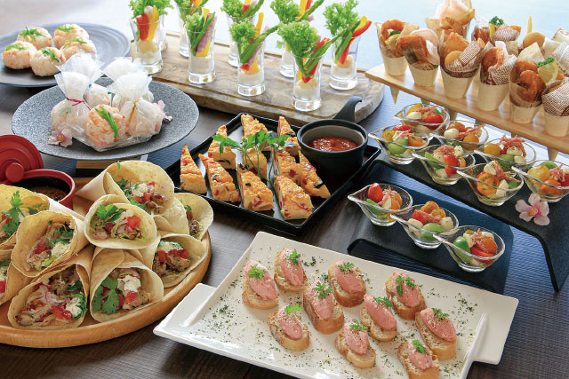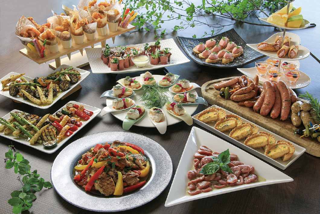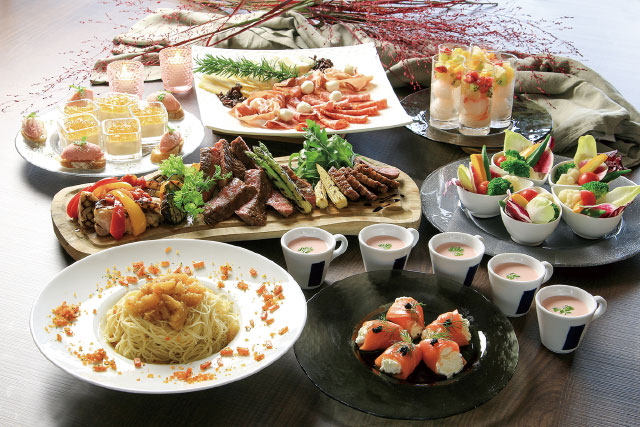 雲丹のフラン/スモークサーモン ディルの風味 ケッパー添え/パストラミビーフ/グリーンサラダ/シャウエッセン スモークソーセージ/ホットドックバリエ/フリットミスト/桜姫のオーブン焼き きのこのグリル 和風醤油ソース/ビーフステーキ ガーリックソース(ハーブ塩・胡椒塩)/ライスジュレ フルーツソース/選手監修メニュー