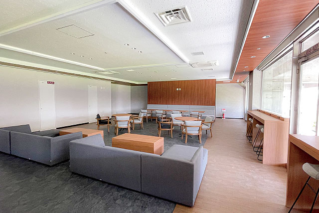 高い天井に窓ガラスが広がる3階のラウンジは広々と開放感のある空間。座席の種類も豊富でリラックスしたひとときをお過ごしいただけます。