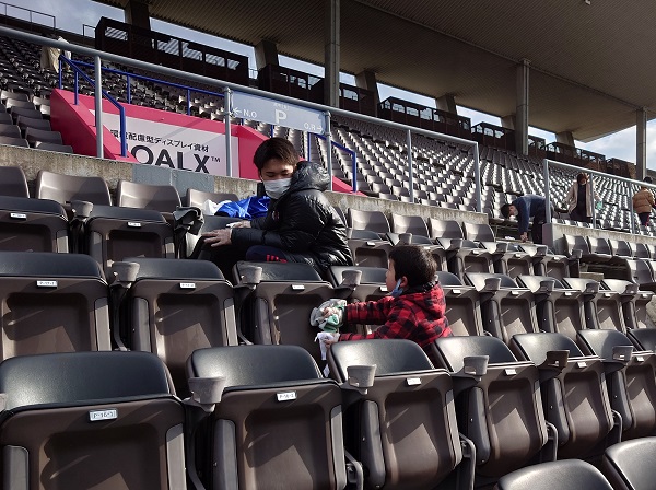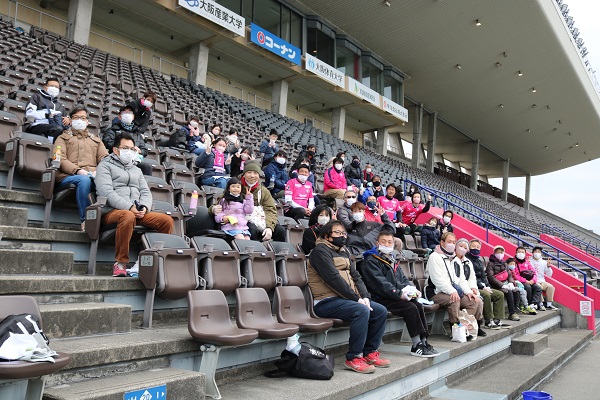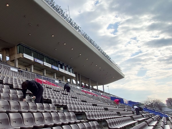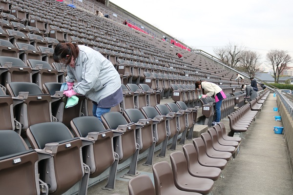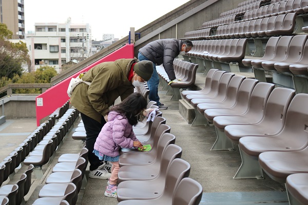 大変寒い中での清掃活動となりましたが、たくさんの方にお集まりいただき、スタッフとともに、バックスタンドの座席をキレイに掃除しました。
