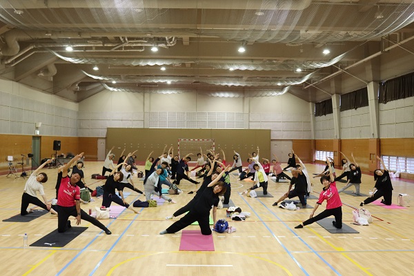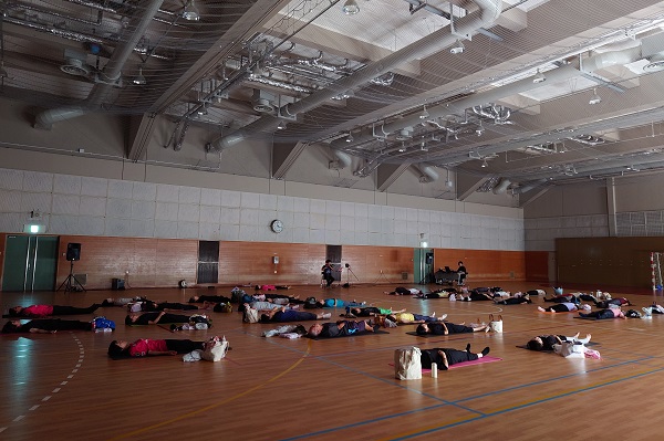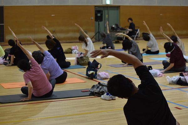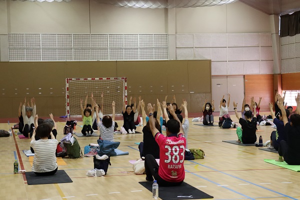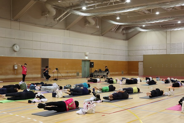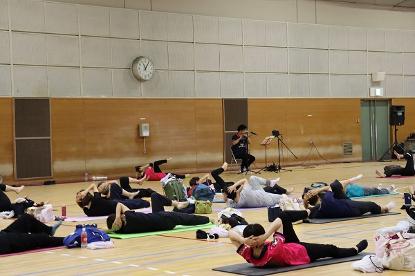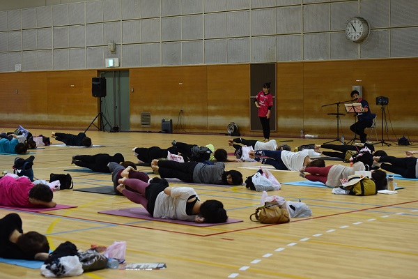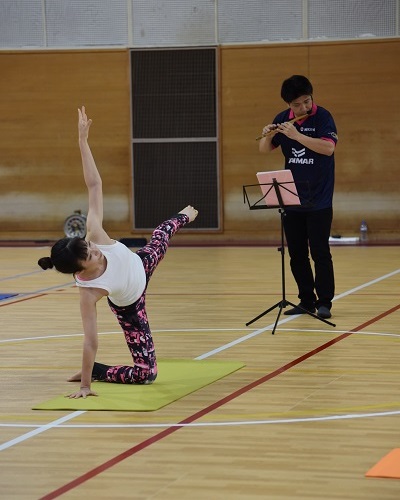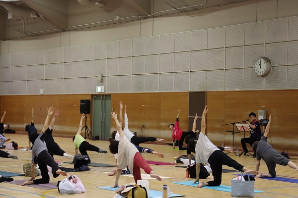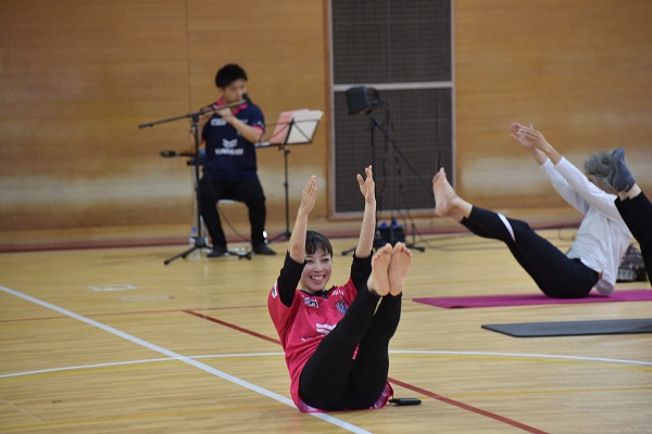 ピラティスインストラクターのnaho先生を講師に、約40名の参加者が一体となって篠笛の生演奏を聴きながら、音色と動く心地よさを体感しました。