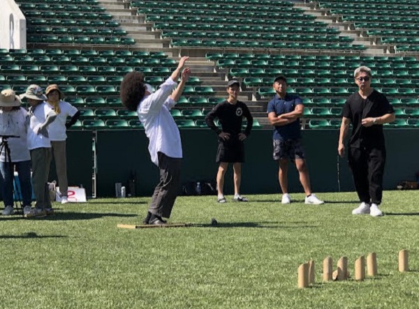 人工芝でのモルックは意外にも難しく、投げたモルックが跳ねてスキットルを飛び越えたり、倒れたスキットルが再び立つなんてこともあります。