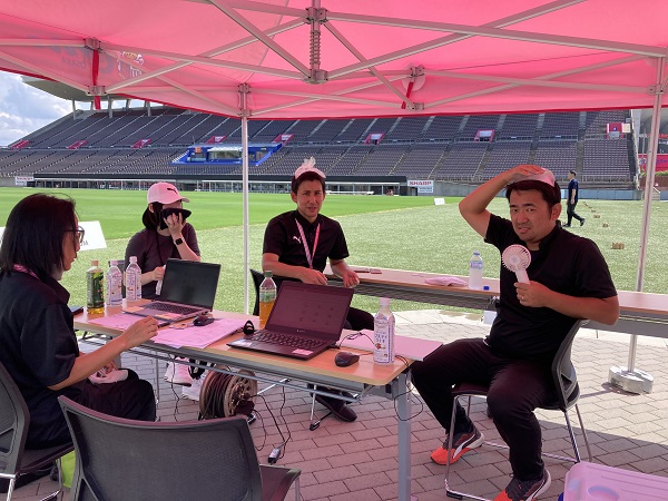 あまりの暑さに、スタッフも試合の合間に氷を頭にのせてクーリングブレイク。