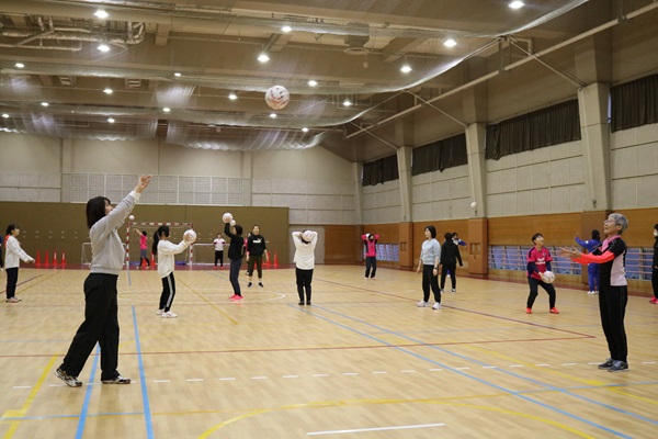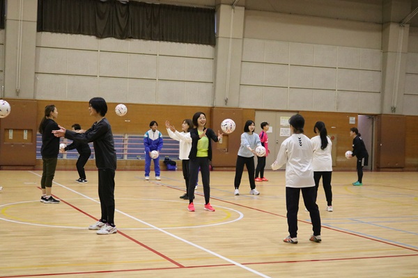ストレッチで体をほぐした後は、ボールフィーリングでボールに慣れていきます。