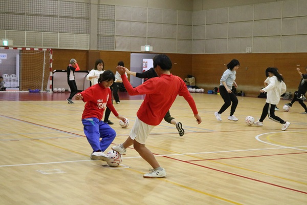 手だけでなく、距離を近づけて足で先にボールを後ろに引くバージョンも行いました。