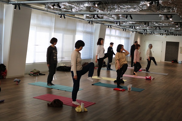 この日は、おしり歩きで骨盤と股関節を緩めて全身の関節の動きをよくし、その後、股関節を動かすストレッチをしました。
