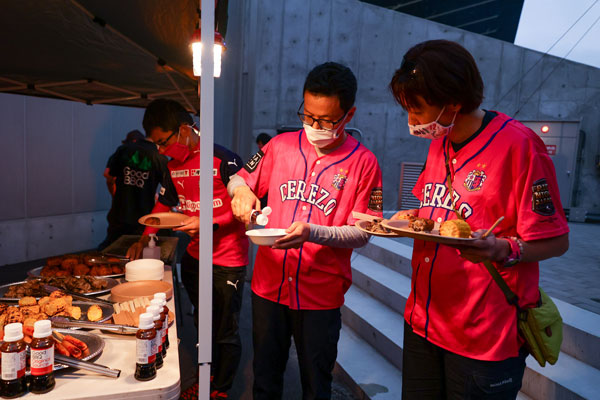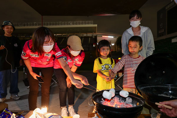 夜は「バーベキュー料理」。暗くなったスタジアムにランタンの光が幻想的な空間を演出して、優雅な時間を過ごしていただきました。さらに「マシュマロ焼き!」体験。焦げないようにゆっくり丹念に焼き上げて、甘く美味しいデザートを堪能していただきました。