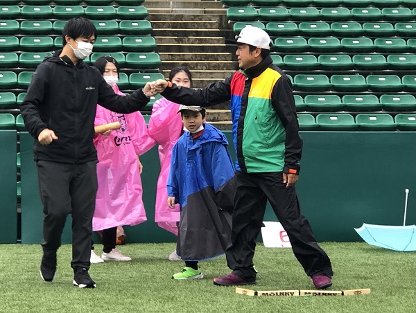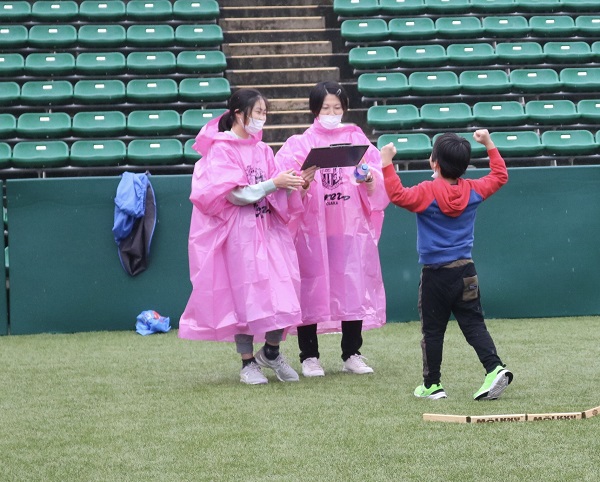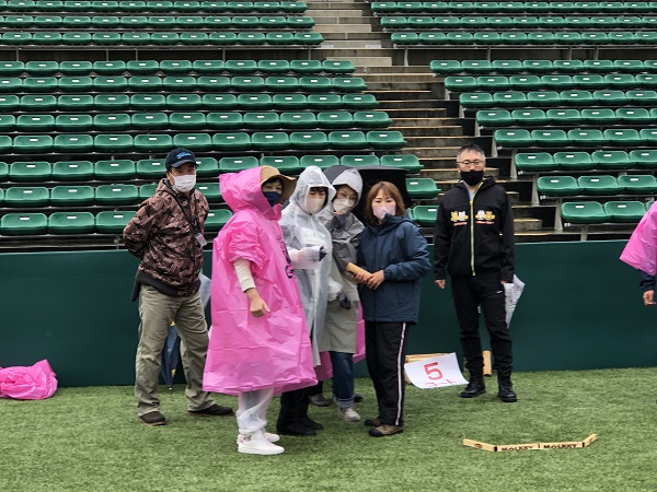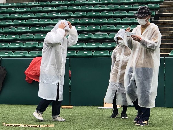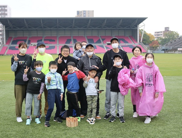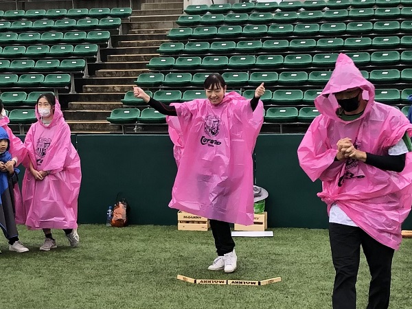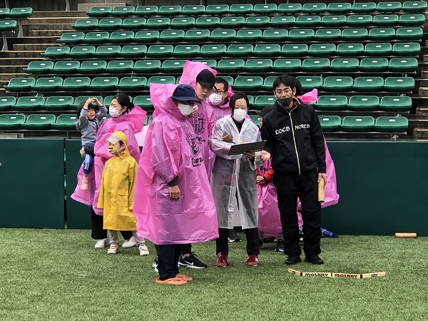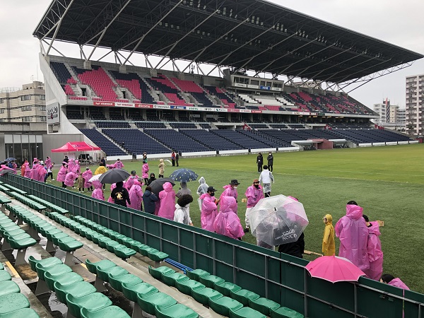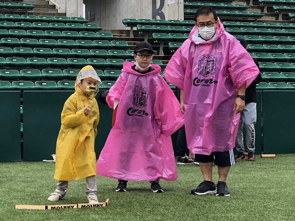 雨対策でセレッソピンクのポンチョを着用していただきました。みなさん同じチームのようで、うれしい気持ちになりました。