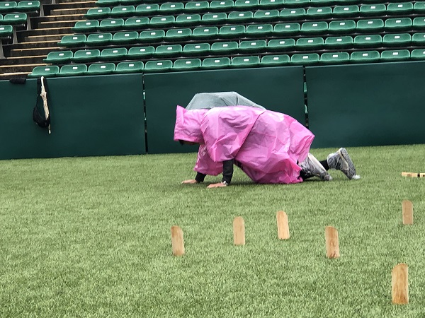人工芝は、想像以上にモルックが跳ねるので、投げ方も工夫が必要になります。