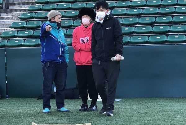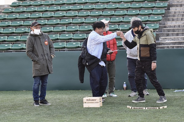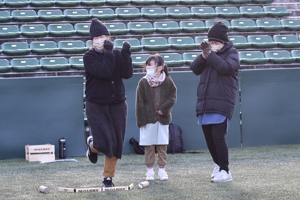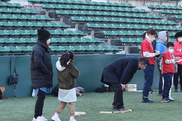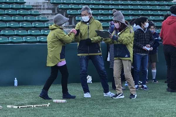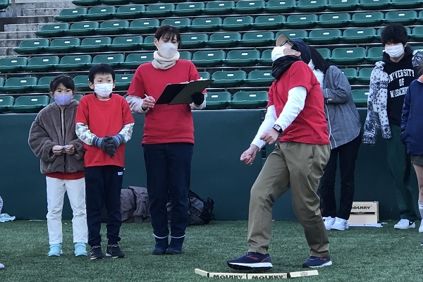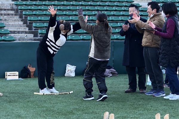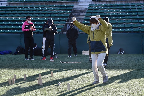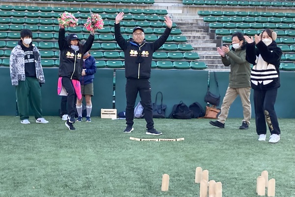 通常モルックの公式戦は土のグラウンドで試合が行われますが、ヨドコウ桜スタジアムでは、ゴムチップ入りの人工芝での試合となります。予期せぬ方向に跳ねる、戻ってくる、倒れたスキットルが再び立つことなどもあり人工芝の攻略が勝敗を大きく左右します。試合が進むにつれ難易度と戦略性が高くなるので、失敗してしまった時はとても悔しそうです・・。