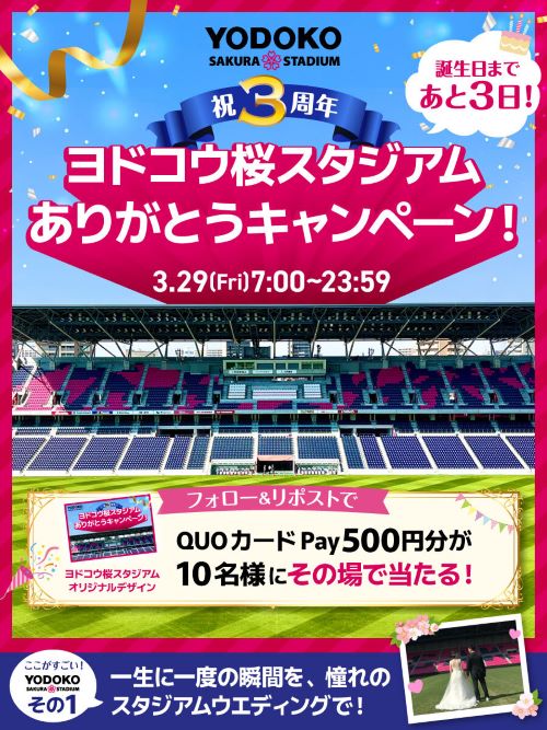このたびの3周年を迎えるにあたり、X(旧Twitter)ヨドコウ桜スタジアム【公式】アカウントにてキャンペーンを実施いたします。